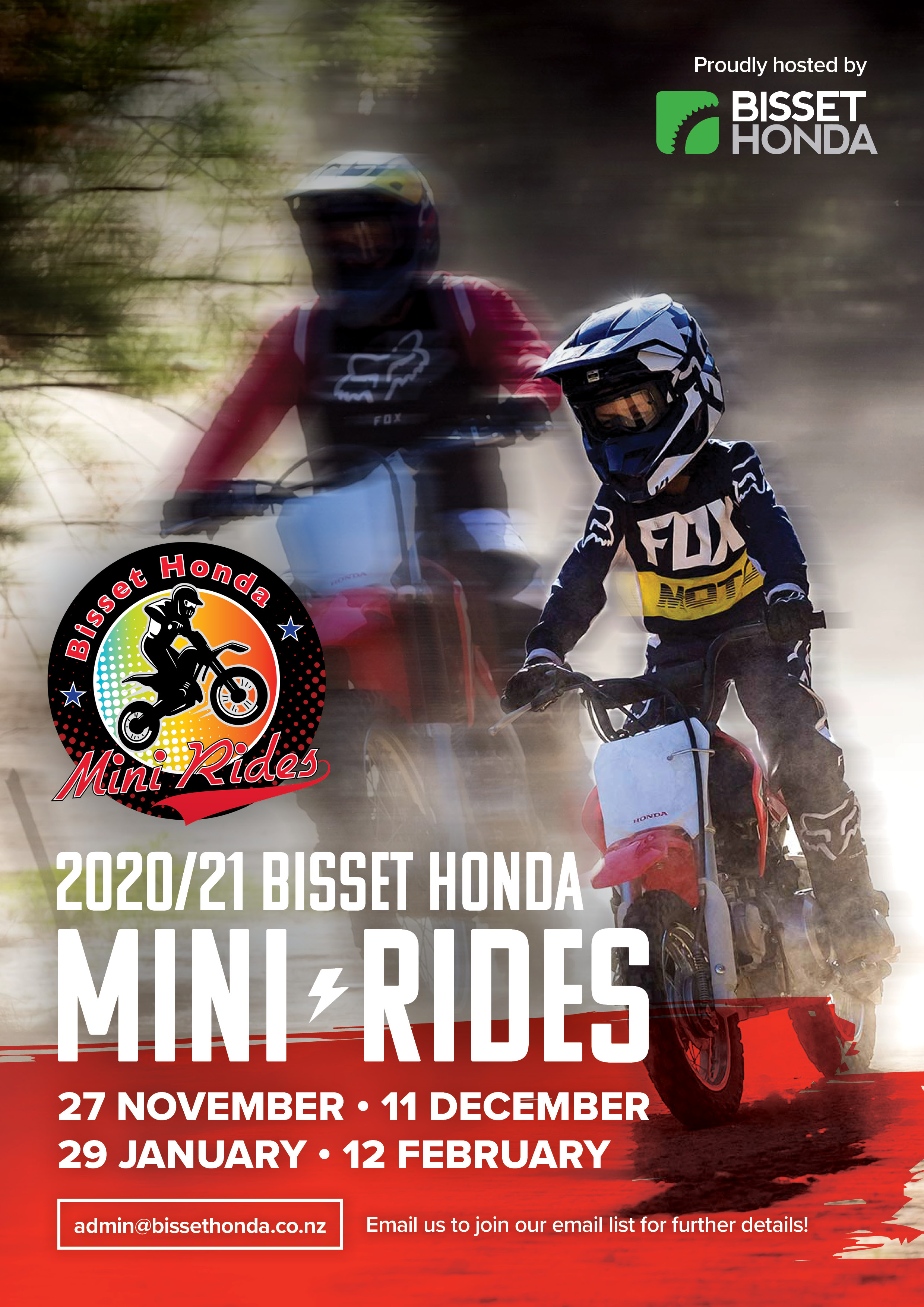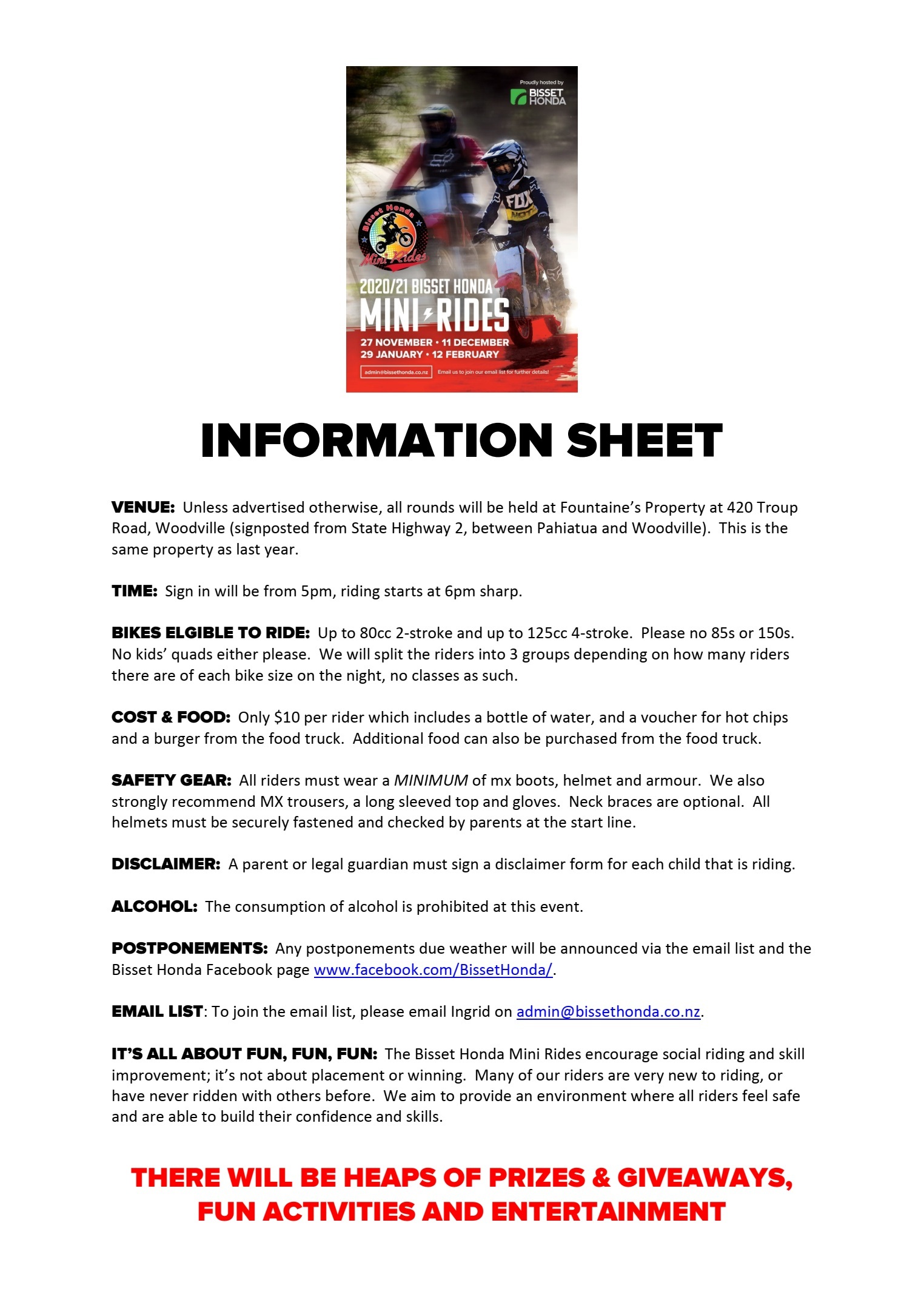 POSTPONEMENTS: Any postponements due weather will be announced via the email list and the Bisset Honda Facebook page