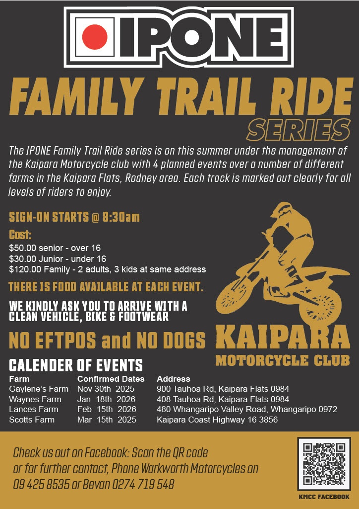 The Ipone Trail Ride series is on this summer under the management of the Kaipara Motorcycle Club with 4 planned events over a number of different farms in the Kaipara Flats, Rodney area. Each track is marked out clearly for all levels of riders to enjoy.