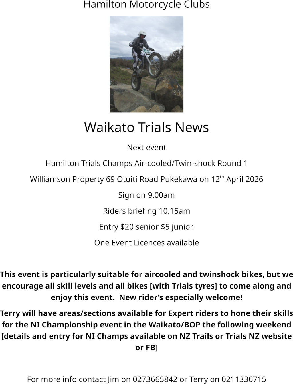 We are sorry to inform you that, because of a probable weather "bomb" affecting our Air Cooled / Twinshock Trials event at Williamsons on the 12th of April, we will postpone the event to the 26th April [day after ANZAC] on the same property [69 Otuiti Rd, Pukekawa] at the same posted time.